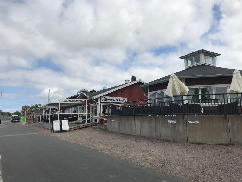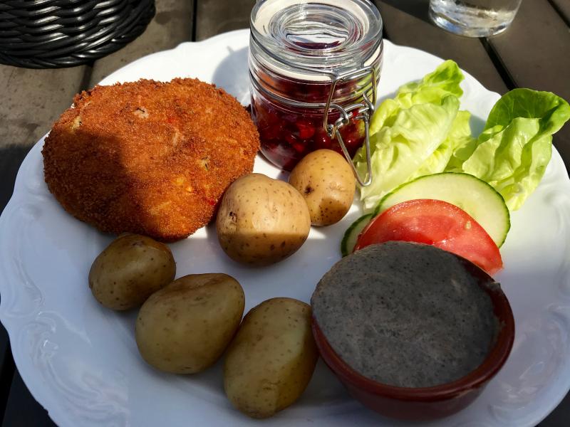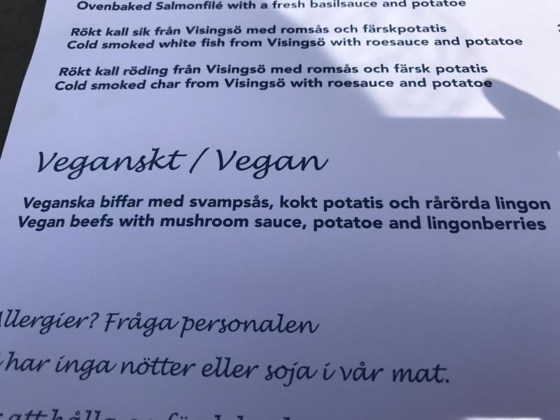 Restaurang vid hamnen i Gränna. På menyn finns en vegansk rätt: biff med svampsås, kokt potatis och rårörda lingon. Biffen är någons sorts panerad grönsaksbiff.