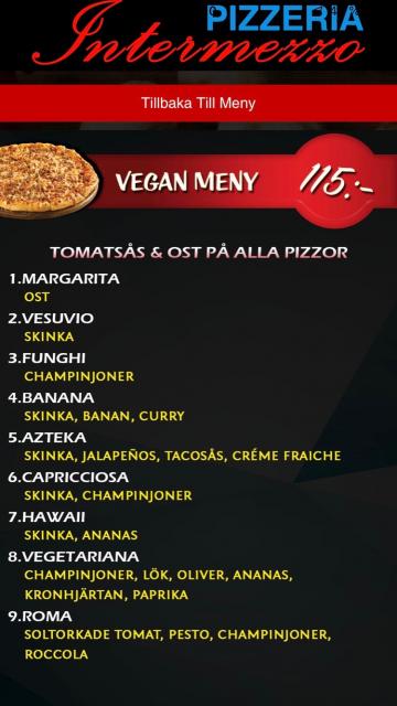 Har en vegansk meny med nio olika pizzor. De har även falafel.