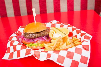 Värmlands bästa burgare. Diner 45´s egen veggieburgare toppad med vår egen mayo, tomat, marinerad rödlök och sallad. Serverad med Country fries, Cole Slaw och slice saltgurka. Vegan – välj med salsa eller äggfri majonäs som topping och tillbehör.