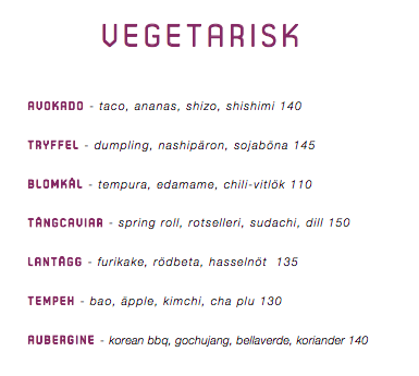 Restaurang som kombinerar smaker från alla de asiatiska köken med en skandinavisk grund. Har en vegetarisk meny med ett flertal veganska rätter som exempelvis minitacos, tryffeldumplings, vårrullar med tångkaviar och bao med tempeh.